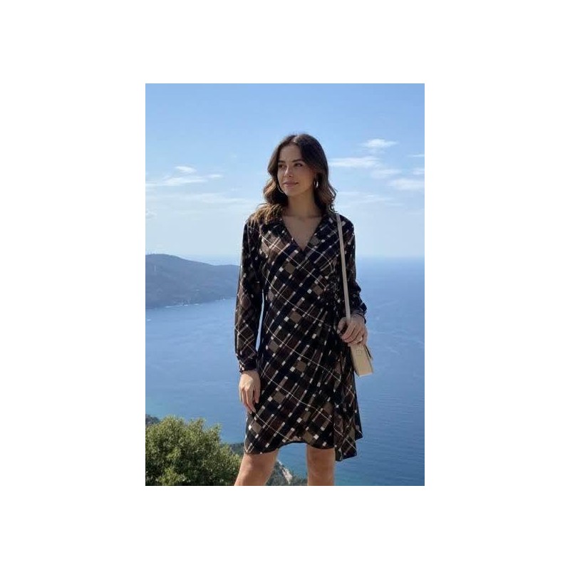 Questo elegante abito a portafoglio cattura l'attenzione con la sua vivace fantasia a quadri, che mescola tonalità calde di marrone e beige con accenti scuri e linee chiare, creando un look sofisticato e moderno. Il design a portafoglio esalta la figura con una silhouette fluida e un drappeggio lusinghiero, mentre lo scollo a V profondo aggiunge un tocco di femminilità. Le maniche lunghe lo rendono ideale per le mezze stagioni o serate più fresche. Perfetto per un brunch informale, un appuntamento pomeridiano o una passeggiata in riva al mare, offre comfort e stile senza sforzo.