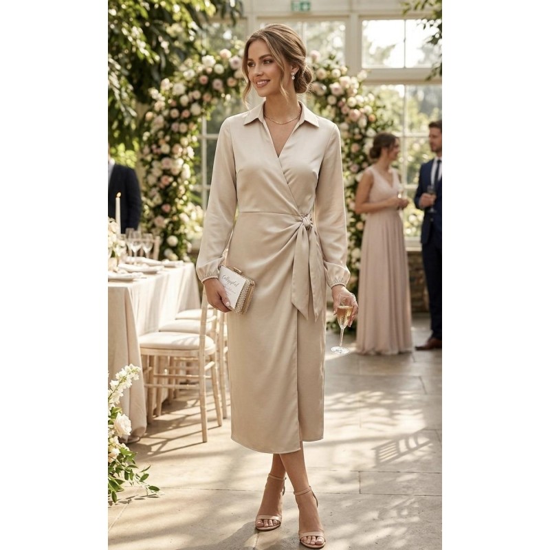 Questo raffinato abito midi a portafoglio è un capo d'elezione per eventi speciali e occasioni che richiedono un tocco di eleganza. Il suo splendido colore champagne lo rende incredibilmente versatile e facile da abbinare, mentre il tessuto effetto raso dona una lucentezza sottile e un drappeggio fluido che accarezza la figura. Il design a portafoglio, con il suo nodo laterale, esalta la vita e crea una silhouette armoniosa e femminile.