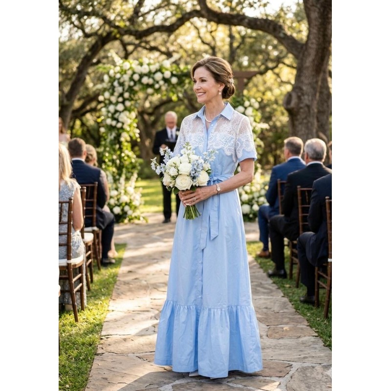 Questo elegante abito maxi chemisier è la scelta perfetta per chi cerca un look sofisticato e confortevole per eventi speciali. Realizzato in una delicata tonalità di celeste, presenta un corpetto in stile camicia con un classico colletto e una pratica abbottonatura frontale che si estende per tutta la lunghezza dell'abito. La parte superiore è arricchita da un magnifico pizzo bianco che si sovrappone alle spalle e alle maniche corte, conferendo un tocco di romanticismo e raffinatezza. La silhouette è valorizzata da una cintura in tessuto coordinata che cinge il punto vita, creando una linea armoniosa. La gonna scende fluida fino a terra, terminando con un'ampia balza a pieghe che aggiunge movimento e grazia all'insieme. Ideale per cerimonie all'aperto, ricevimenti o come abito da invitata, combina eleganza e praticità con un fascino senza tempo.