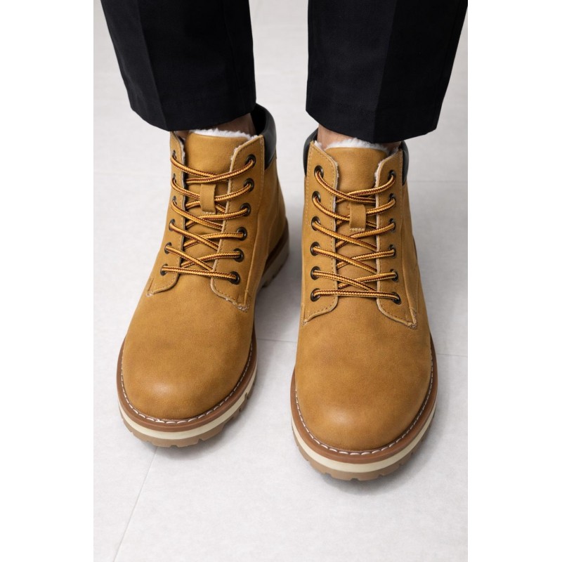 Affronta le giornate più fredde con stile e comfort grazie a questi anfibi invernali in tonalità camel. Realizzati con una tomaia resistente effetto nabuk, offrono un look robusto e alla moda. L'interno è completamente foderato in morbida pelliccia sintetica, garantendo un calore avvolgente e un comfort eccezionale per tutto il giorno. I lacci bicolore (giallo e marrone) con occhielli metallici permettono una calzata sicura e personalizzabile. La suola carrarmato spessa e multistrato non solo conferisce un tocco distintivo, ma assicura anche un'ottima aderenza su diverse superfici e un eccellente isolamento dal freddo. Perfetti per completare un outfit casual o per le tue avventure invernali.