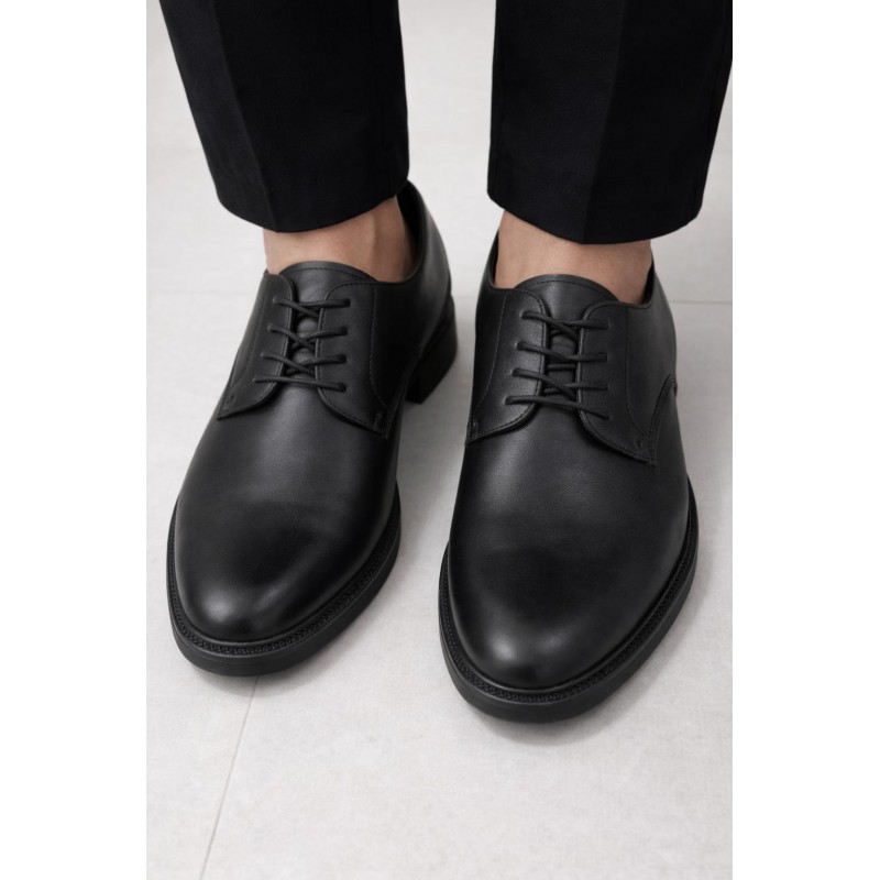 Queste scarpe Derby in pelle liscia nera sono un classico intramontabile, ideali per elevare qualsiasi outfit. Caratterizzate da un'elegante allacciatura aperta a quattro occhielli, offrono un design pulito e versatile. La pelle di alta qualità assicura una finitura raffinata e una lunga durata, mentre la suola robusta garantisce comfort e aderenza per un utilizzo quotidiano. Perfette per completare un look formale in ufficio o per aggiungere un tocco di sofisticazione a un abbigliamento smart casual.