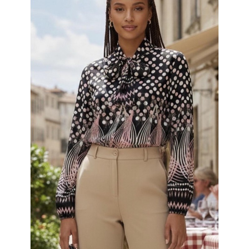 Questa sofisticata camicia in raso nero è un capo d'abbigliamento che unisce eleganza e originalità. Il design si distingue per il contrasto armonioso tra il classico motivo a pois bianchi e rosa chiaro, che decora la parte superiore e le maniche, e una complessa fantasia astratta. Quest'ultima, con le sue linee sinuose e dettagli geometrici nelle tonalità del rosa, bianco e nero, crea un effetto visivo dinamico e moderno sulla parte inferiore della blusa e sui polsini. Il collo è impreziosito da un elegante fiocco da annodare, che aggiunge un tocco di raffinatezza e femminilità, rendendola perfetta per occasioni speciali o per elevare un outfit da ufficio. Le maniche lunghe si concludono con polsini elaborati che richiamano la fantasia del corpo della camicia. Realizzata in un tessuto satinato lucido, questa camicia è ideale per chi cerca un capo distintivo e chic.