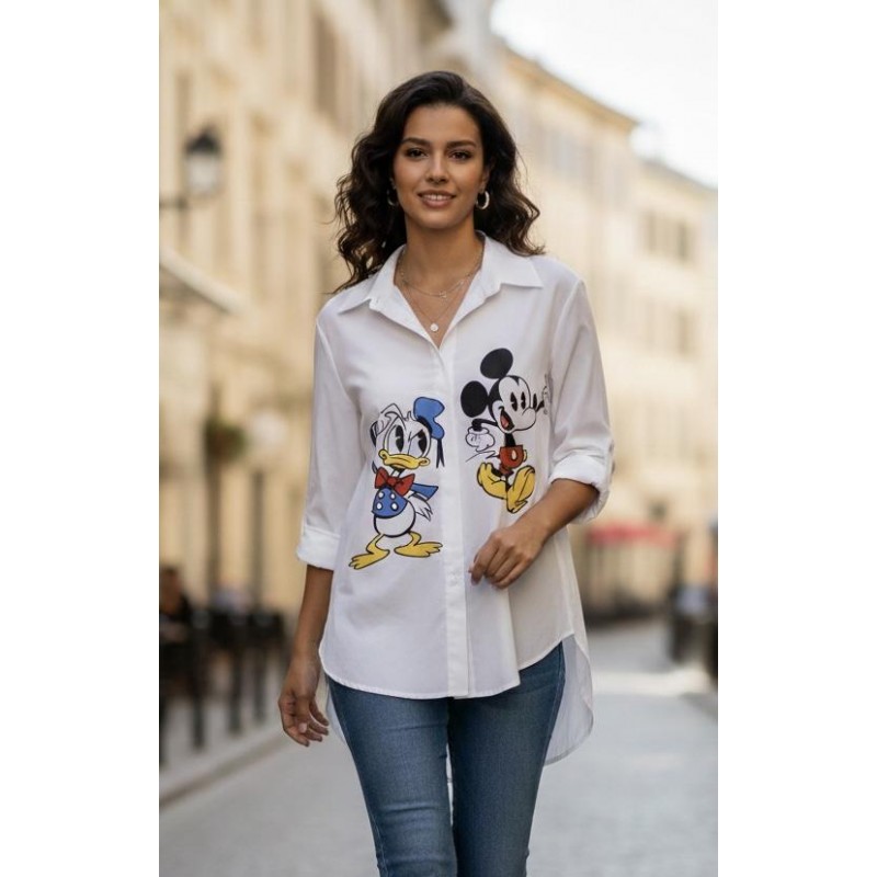 Porta un tocco di allegria e stile nel tuo guardaroba con la nostra camicia bianca oversize impreziosita dalle vivaci stampe di Paperino e Topolino. Questa camicia unisce il comfort di un taglio rilassato alla giocosità dei personaggi Disney, rendendola perfetta per un look casual ma distintivo. Dotata di un classico collo a camicia e una chiusura frontale con bottoni, offre versatilità e praticità. Le maniche lunghe possono essere comodamente arrotolate e fissate con un bottone e una linguetta interna, adattandosi a diverse occasioni e condizioni climatiche. L'orlo asimmetrico, più lungo sul retro, aggiunge un tocco moderno e dinamico al design. Ideale da abbinare a jeans per un outfit quotidiano o a pantaloni più eleganti per un tocco originale, questa camicia è un must-have per chi ama la moda con un pizzico di magia.
