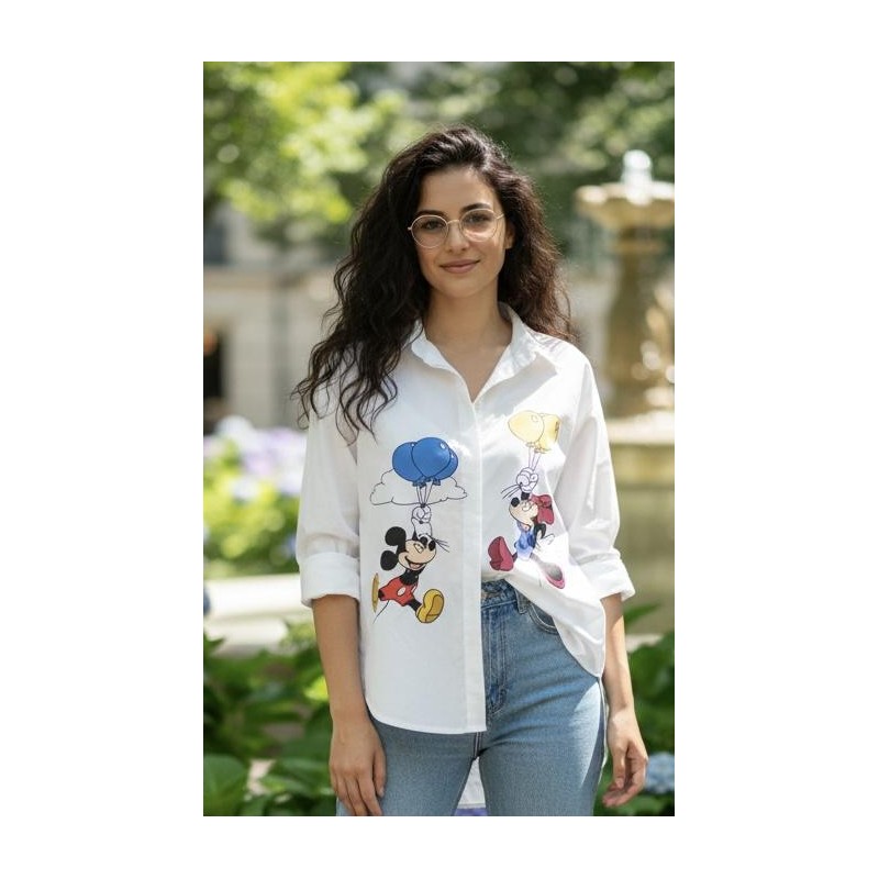 Questa allegra camicia bianca cattura l'essenza della nostalgia e del divertimento con le sue stampe vivaci. Realizzata in un tessuto leggero e traspirante, offre comfort e stile per tutto il giorno. Il design presenta un classico colletto e una chiusura con bottoni sul davanti, mentre le maniche lunghe possono essere comodamente arrotolate per adattarsi a diverse occasioni e temperature. Le protagoniste sono le adorabili figure di Mickey Mouse e Minnie Mouse, raffigurate mentre fluttuano con palloncini colorati, aggiungendo un tocco giocoso e unico. Ideale per un look casual-chic, questa camicia è perfetta per chi ama esprimere la propria personalità con un tocco Disney.