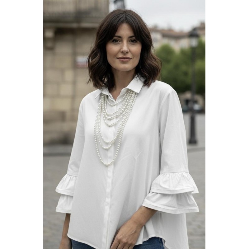 Le maniche a 3/4 sono il vero punto di forza, ornate da graziose doppie balze che aggiungono un tocco di femminilità e movimento, rendendola perfetta per ogni occasione. La vestibilità oversize offre una silhouette rilassata e fluida, ideale per chi cerca uno stile casual-chic ma raffinato.
