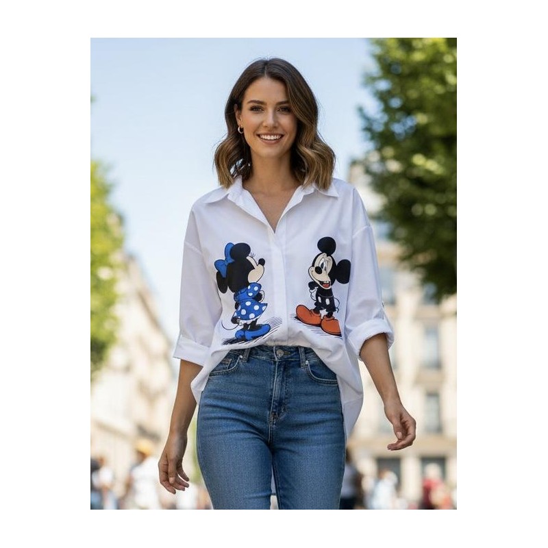 Questa vivace camicia oversize in cotone bianco è un capo d'abbigliamento irresistibile per chi ama unire stile e divertimento. Caratterizzata da una stampa oversize di Topolino e Minni posizionati in modo giocoso sul davanti, aggiunge un tocco iconico e nostalgico al tuo outfit. Il design ampio e rilassato garantisce massimo comfort e versatilità, rendendola perfetta per diverse occasioni casual. Dotata di un classico colletto a punta e chiusura a bottoni, le maniche lunghe possono essere indossate distese o arrotolate per un look più disinvolto, come mostrato in foto. Ideale per essere abbinata a jeans o leggings, questa camicia è un must-have per esprimere la tua personalità con un tocco di allegria.