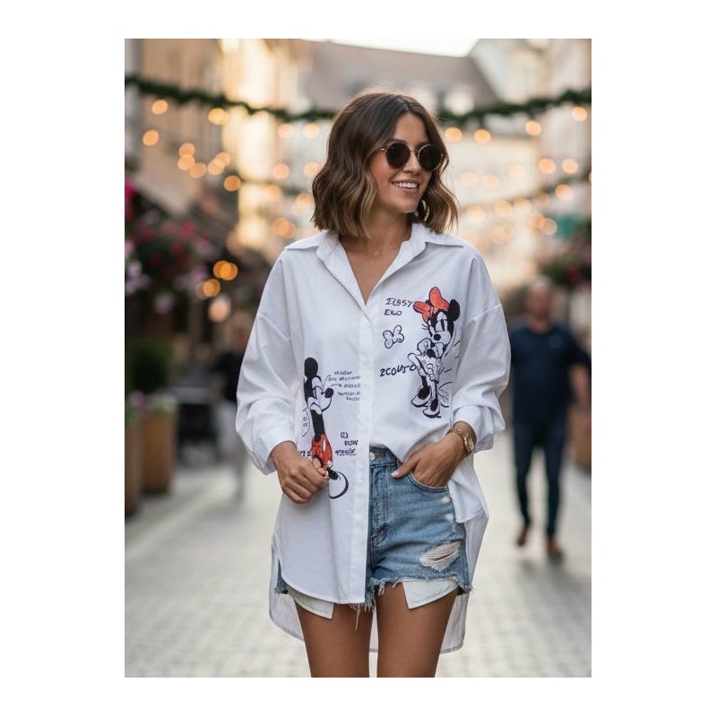 Questa camicia oversize bianca è un capo d'abbigliamento divertente e alla moda, perfetto per chi ama un tocco giocoso nel proprio outfit. Realizzata in un tessuto leggero e confortevole, presenta una vestibilità ampia e rilassata che la rende ideale per un look casual-chic. Il design è arricchito da stampe grafiche di Topolino e Minnie, con dettagli testuali che aggiungono un elemento unico e distintivo. L'orlo asimmetrico, più lungo sul retro, conferisce un tocco contemporaneo e permette diverse opzioni di styling, come indossarla sopra shorts o jeans per un look disinvolto ma ricercato. È un capo versatile che può essere facilmente abbinato per creare outfit accattivanti per il tempo libero o uscite informali.