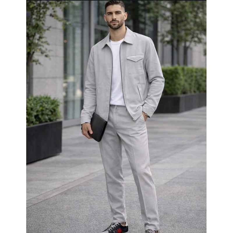 Questo completo coordinato presenta una giacca bomber leggera in un delicato tono di grigio chiaro, caratterizzata da una chiusura full zip e un colletto classico, abbinata a pantaloni dal taglio sartoriale nello stesso colore. I pantaloni offrono una vestibilità comoda e versatile, perfetti per un'eleganza rilassata. Sotto la giacca, una T-shirt bianca crea un contrasto fresco e luminoso, esaltando la pulizia dell'intero outfit. Completano il look un paio di sneakers con dettagli di design, che aggiungono un tocco moderno e dinamico. Questo coordinato è la scelta ideale per chi cerca uno stile raffinato ma disinvolto, adatto a diverse occasioni, dalle passeggiate in città agli incontri informali, specialmente nelle stagioni più miti.