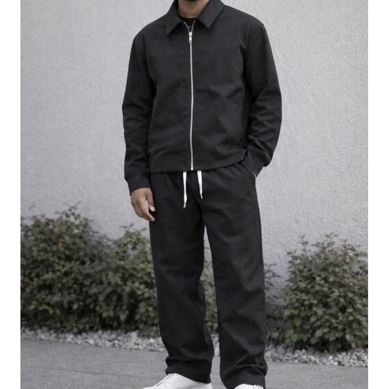 Questo coordinato casual offre un'estetica moderna e pulita, perfetta per un look quotidiano ma ricercato. La giacca, con il suo taglio essenziale, zip frontale argentata e colletto classico, si abbina splendidamente ai pantaloni neri dal fit rilassato. La coulisse bianca a contrasto sui pantaloni aggiunge un tocco di stile distintivo. Realizzato per garantire comfort e libertà di movimento, questo completo total black è estremamente versatile, ideale per diverse occasioni, dal tempo libero agli impegni più informali. Un capo essenziale che unisce praticità e tendenza.
