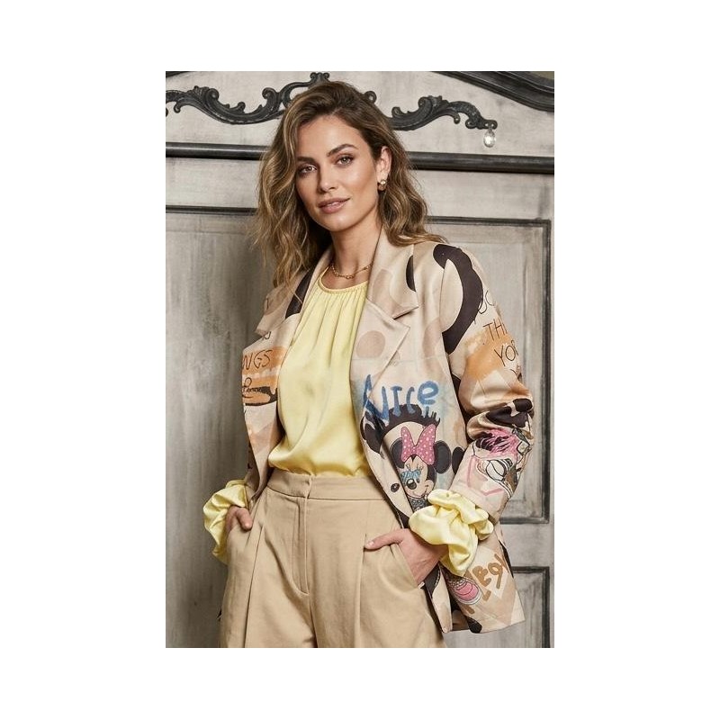 Questo blazer cattura l'attenzione con il suo design divertente ma sofisticato. La base color beige neutro offre uno sfondo elegante per la vivace stampa all-over, che include elementi cartoon come un'adorabile Minnie Mouse, e grafiche e scritte ispirate ai graffiti. Presenta revers classici e una vestibilità strutturata ma rilassata, rendendolo perfetto per aggiungere un tocco di personalità a qualsiasi outfit. Ideale da abbinare a un top semplice e pantaloni per un look casual contemporaneo, o sopra un vestito per un tocco inaspettato. La stampa grafica unica ti garantirà di distinguerti con stile.