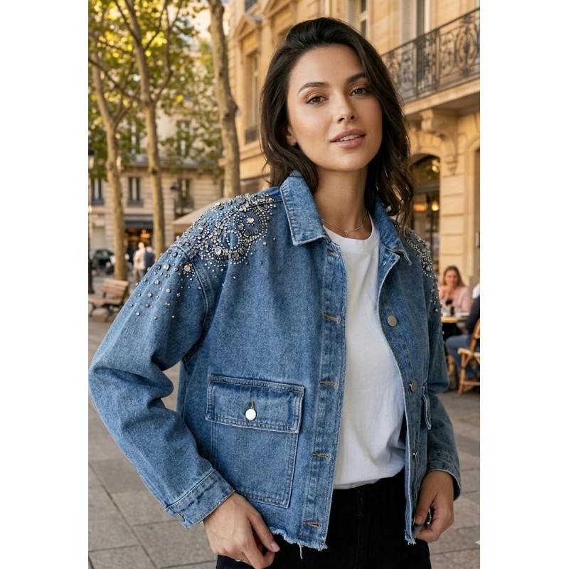 Una giacca di jeans che cattura l'attenzione, perfetta per chi ama un tocco di glamour. Realizzata in denim di media tonalità, questa giacca presenta un design distintivo con spalle e parte superiore delle maniche riccamente decorate con una miriade di strass, perline e dettagli scintillanti, formando motivi eleganti e brillanti. Il taglio rilassato assicura comfort e versatilità, rendendola ideale per outfit casual chic. Dettagli pratici includono due ampie tasche applicate sul davanti con chiusura a patta e bottoni. L'orlo sfrangiato aggiunge un tocco di modernità e disinvoltura, completando il look unico di questo capo. Abbinala a un semplice t-shirt bianco e pantaloni neri per un look che non passa inosservato.