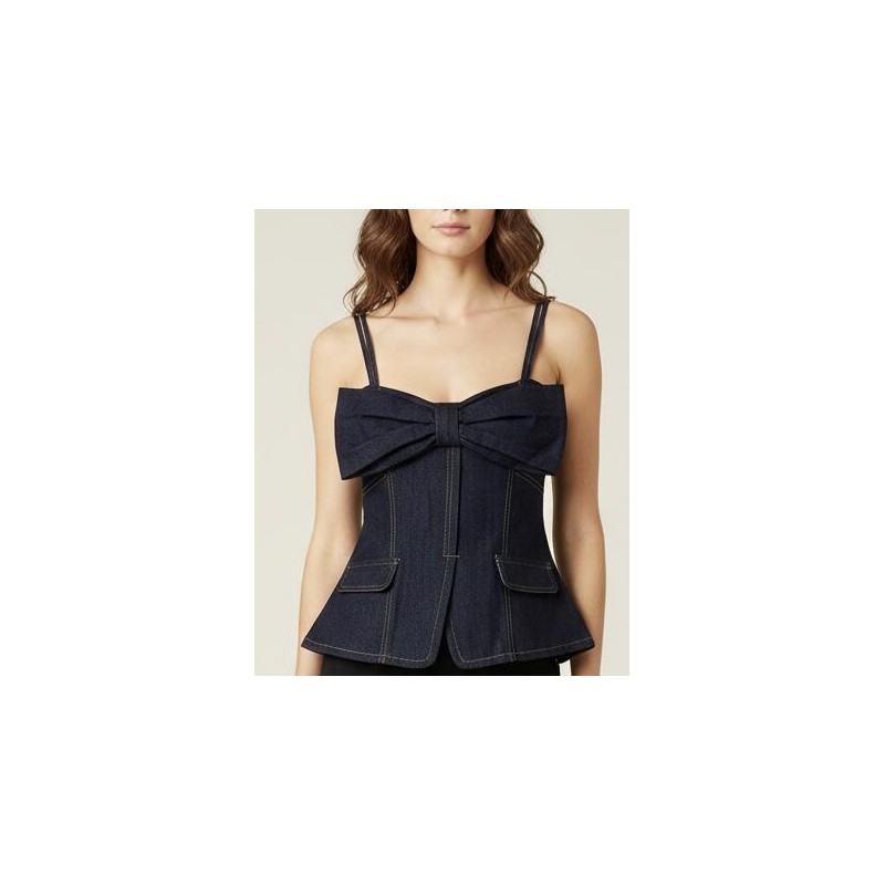 Questo accattivante top è confezionato in robusto denim scuro, offrendo un'interpretazione moderna e chic del tessuto classico. Sebbene non sia un capo di maglieria tradizionale, si distingue per il suo design unico e la sua struttura definita. Il suo design distintivo è dominato da un grande fiocco frontale che aggiunge un tocco giocoso e sofisticato al décolleté. Le spalline sottili e lo scollo dritto contribuiscono a un look pulito e contemporaneo.