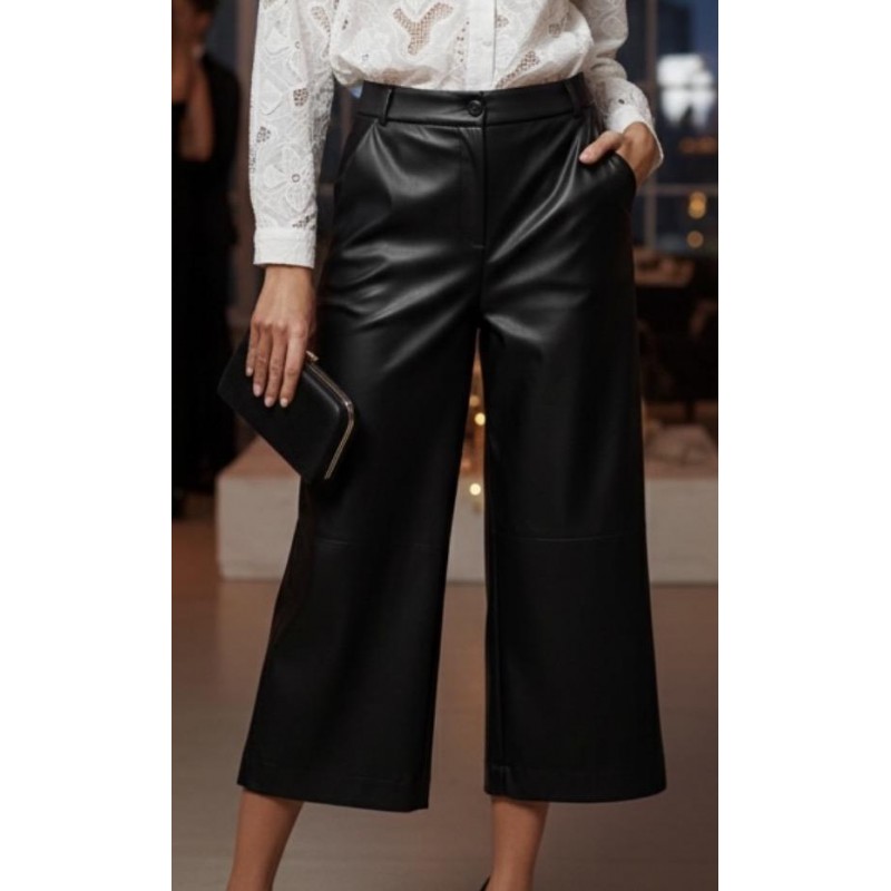Questi pantaloni culotte neri sono un capo d'abbigliamento audace e sofisticato, perfetti per chi cerca uno stile contemporaneo. Realizzati in similpelle lucida, offrono un look moderno e grintoso, mantenendo al contempo un'eleganza raffinata.