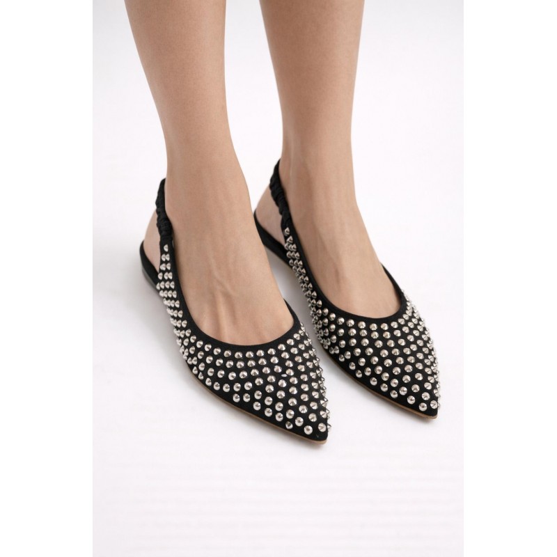 Queste ballerine slingback nere sono l'emblema della fusione tra eleganza classica e audacia contemporanea. La tomaia, realizzata in un raffinato tessuto nero, è impreziosita da una miriade di borchie metalliche argentate che ricoprono l'intera superficie, creando un effetto scintillante e deciso.