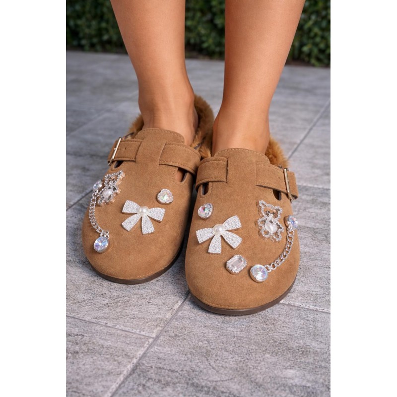 Scopri il perfetto connubio tra comfort avvolgente e stile scintillante con questi zoccoli unici. Realizzati in un morbido materiale effetto camoscio color cammello, sono impreziositi da una lussuosa fodera interna e un bordo in pelliccia sintetica, garantendo calore e morbidezza ad ogni passo. La vera magia risiede nelle ricche decorazioni: fiocchi glitterati con perle centrali, gemme iridescenti di varie forme e accattivanti charm con catenelle, tra cui spicca un adorabile orsetto. Il cinturino regolabile con fibbia metallica non solo aggiunge un tocco di eleganza ma assicura anche una calzata personalizzata. Ideali per chi desidera aggiungere un tocco di glamour giocoso al proprio look, sia per rilassarsi in casa con stile che per un'uscita casual chic.