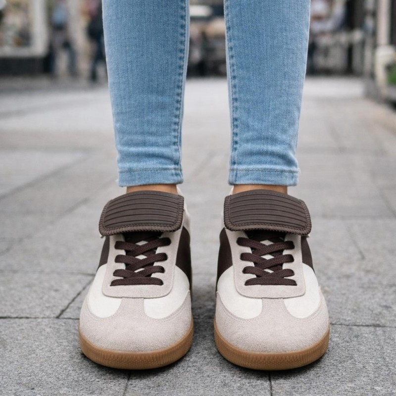 Il marrone scuro è elegantemente utilizzato per i dettagli laterali e, soprattutto, per la caratteristica linguetta ripiegabile, che non è solo un elemento stilistico ma aggiunge anche un volume interessante al design complessivo. I lacci marroni si abbinano perfettamente, completando l'estetica raffinata.