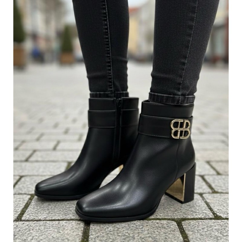 Questi stivaletti neri incarnano l'eleganza contemporanea, perfetti per ogni occasione, dal look casual chic all'outfit più formale. Realizzati con un materiale liscio e di qualità, offrono una silhouette pulita e raffinata. Il design è arricchito da una fibbia decorativa dorata con un distintivo logo, posizionata delicatamente sulla fascia alla caviglia, che conferisce un tocco di brillantezza e lusso. Il tacco squadrato, con il suo inserto metallico dorato, non solo garantisce stabilità e comfort ma aggiunge anche un elemento di stile audace che cattura l'attenzione. La pratica cerniera laterale assicura una calzata facile e veloce, mentre la punta leggermente squadrata completa il look moderno e sofisticato di questi stivaletti imprescindibili.