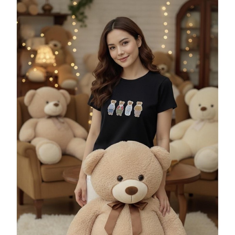 Questa t-shirt nera è un capo d'abbigliamento versatile e adorabile, perfetto per chi desidera aggiungere un tocco di dolcezza e originalità al proprio guardaroba. Il design frontale è impreziosito da una fila di quattro orsetti stilizzati, ognuno vestito con un outfit diverso e alla moda, che conferiscono alla maglietta un carattere distintivo e divertente.