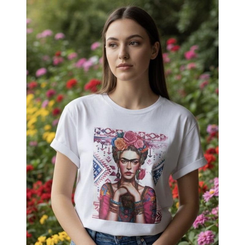 Il design presenta un magnifico ritratto di Frida Kahlo, ornata dalla sua distintiva corona di fiori e con lo sguardo intenso che l'ha resa famosa. Sullo sfondo, un intricato motivo geometrico di ispirazione etnica aggiunge un tocco di autenticità e vivacità, richiamando le radici culturali dell'artista. I colori vivaci e i dettagli curati rendono questa stampa un vero capolavoro da indossare.