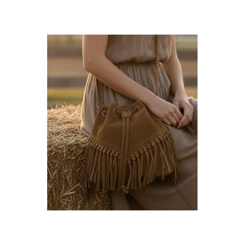 Il suo design è caratterizzato da una pratica chiusura a coulisse e da una generosa cascata di frange che adornano la parte inferiore, conferendole un movimento dinamico e uno spirito selvaggio. La tracolla sottile e regolabile permette di indossarla comodamente sia a spalla che a tracolla, rendendola un accessorio versatile e funzionale per l'uso quotidiano o per le occasioni più casual.